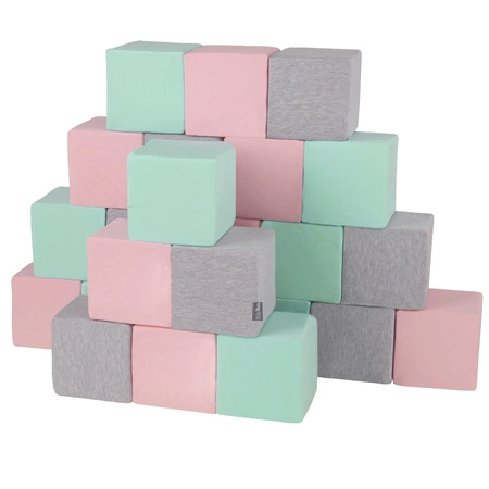 KiddyMoon Schaumstoff Würfel für Baby Weiche Blöcke Schaum Spielzeug Montessori-Spielzeug mit Schaum und viel Spaß für Kinder, Hergestellt in der EU, Blöcke: hellgrau-pink-mint, 24 Stücke