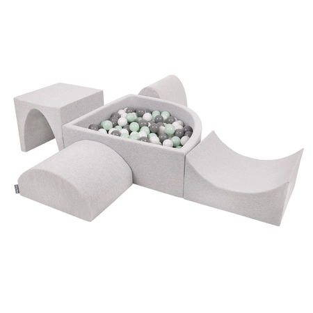 KiddyMoon Spielplatz Schaumstoff mit Viertel Eckig Bällebad Bälle Hindernisläufe, hellgrau:weiß/grau/minze, Bällebad (200 Bälle) + Version 1