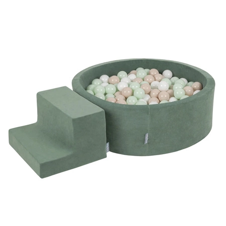 KiddyMoon Spielplatz Velvet Aus Schaumstoff Mit Samt Rund Bällebad Ballgruben Für Babys Spielbad Hindernisläufen, Hergestellt In Der EU, pastellbeige/weiß/minze, Bällebad (100 Bälle) + Stüfchen
