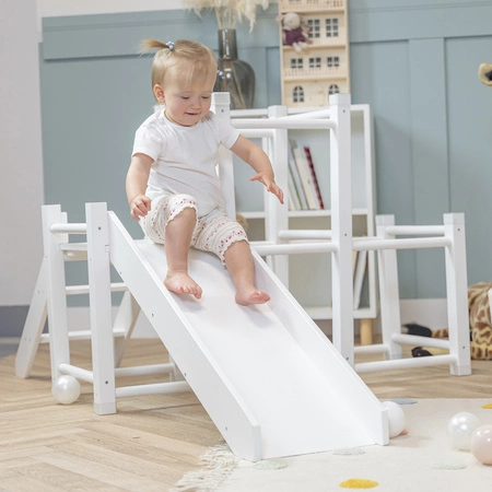 Das klassische Design dieses Spielplatzes passt perfekt zu den Trends in Kinderzimmern und Spielzimmern. Das Springen über die Sprossen, das Klettern der Leiter und das Hinunterrutschen auf der Rutsche machen viel Spaß zu Hause. In Kombination mit dem trockenen Bällebad entsteht ein privates Spielzimmer. Ihr Kind kann klettern, rutschen und sich bewegen, wann immer es Lust dazu hat. Außerdem fördert ein Spiel, das mit körperlicher Aktivität verbunden ist, den Gleichgewichtssinn, die Körperhaltung und die allgemeine Fitness der Kinder.