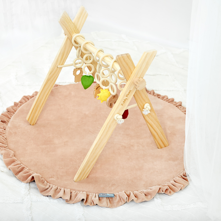 Der Holzturntrapez für Babys, mit einer weichen Matte, oder auch ohne erhältlich. Der Turnständer ist so konzipiert, dass er die Augen fokussiert, die Sinne stimuliert und das Spiel des Babys von den ersten Tagen an fördert. Die Matte bietet Schutz vor harten und kalten Böden. Die natürlichen Farben und die sorgfältige Verarbeitung lassen dieses Set exquisit aussehen und sind eine stilvolle Ergänzung zur Inneneinrichtung eines Kinderzimmers.