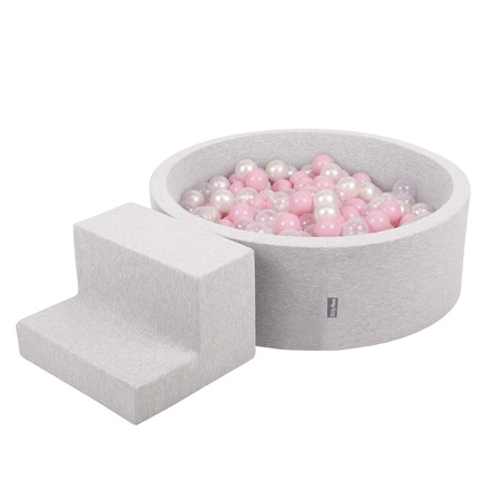 KiddyMoon Spielplatz aus Schaumstoff mit Rund Bällebad (200 Bälle) Ballgruben für Babys Spielbad Hindernisläufen, Hergestellt in der EU, hellgrau:puderrosa/perle/transparent, Bällebad (200 Bälle) + Stüfchen