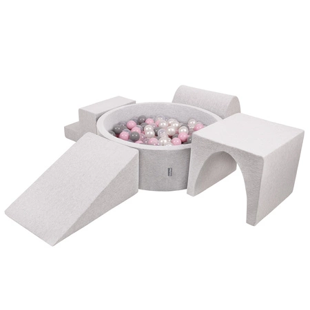 KiddyMoon Spielplatz aus Schaumstoff mit Bällebad und Bällen Hindernisläufen, hellgrau:perle/grau/transparent/puderrosa, Bällebad (300 Bälle) + Version 3