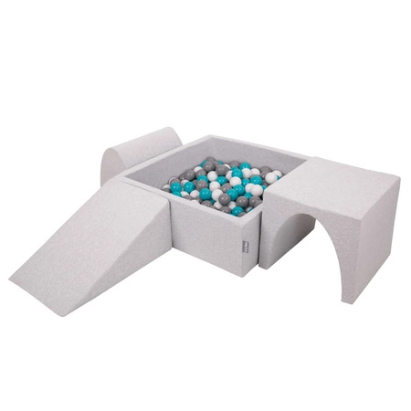 KiddyMoon Spielplatz aus Schaumstoff mit Quadrat Bällebad Bälle Hindernisläufen, hellgrau:grau/weiß/türkis, Bällebad (200 Bälle) + Version 2