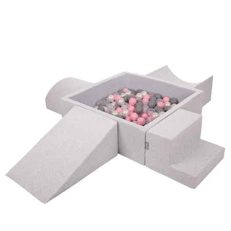 KiddyMoon Spielplatz aus Schaumstoff mit Quadrat Bällebad Bälle Hindernisläufen, hellgrau:perle/grau/transparent/puderrosa, Bällebad (200 Bälle) + Version 5