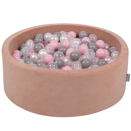KiddyMoon Rund Bällebad Velvet Bällepool ∅ 7Cm Ballgruben Für Babys Spielbad Kleinkinder, Hergestellt in der EU, wüstenrosa: perle/grau/transparent/rosa, 90x30cm/300 Bälle