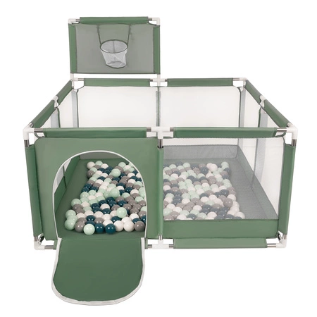Laufstall mit Korb und Bällen Laufgitter für Kinder, grün:dunkeltürkis/grau/weiß/minze, 200 Bälle