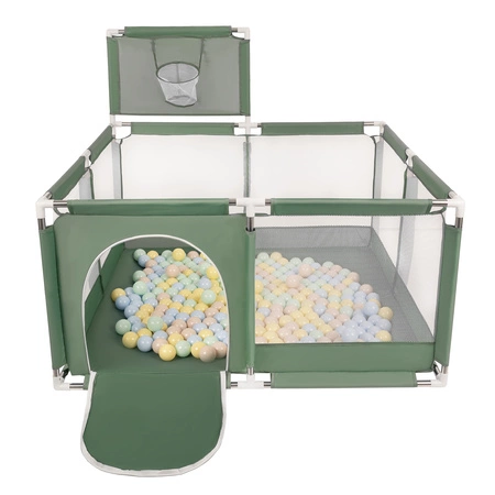 Laufstall mit Korb und Bällen Laufgitter für Kinder, grün:pastellbeige/pastellblau/pastellgelb/minze, 200 Bälle