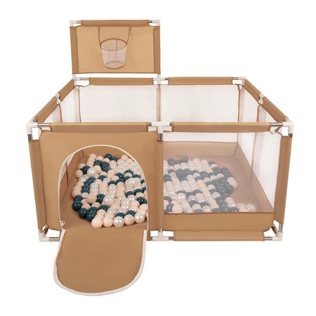 Laufstall mit Korb und Bällen Laufgitter für Kinder, beige:dunkeltürkis/pastellbeige/perle, 100 Bälle